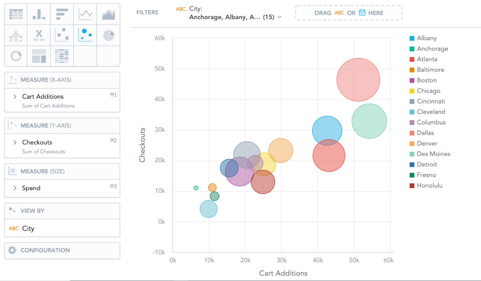 Bubble charts have the following sections: Measure (X-axis), Measure (Y-axis), Measure (Size), View by, and Configuration.