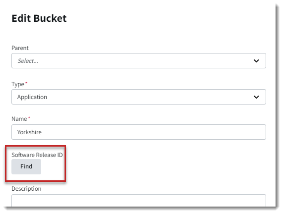 2. On the Create Bucket or the Edit Bucket slideout, locate the Software Release ID field. (If necessary, refer to the instructions in Creating a Bucket or Editing a Bucket for accessing either slideout.)