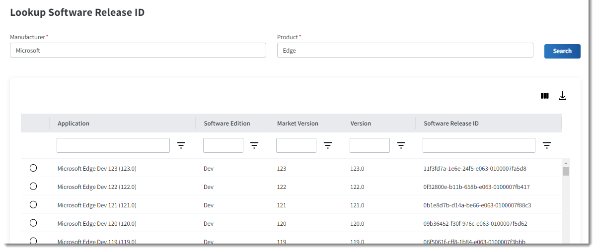 2. Click Select to return to the bucket definition. The Software Release ID field displays the correct Technopedia release ID for the application you selected.